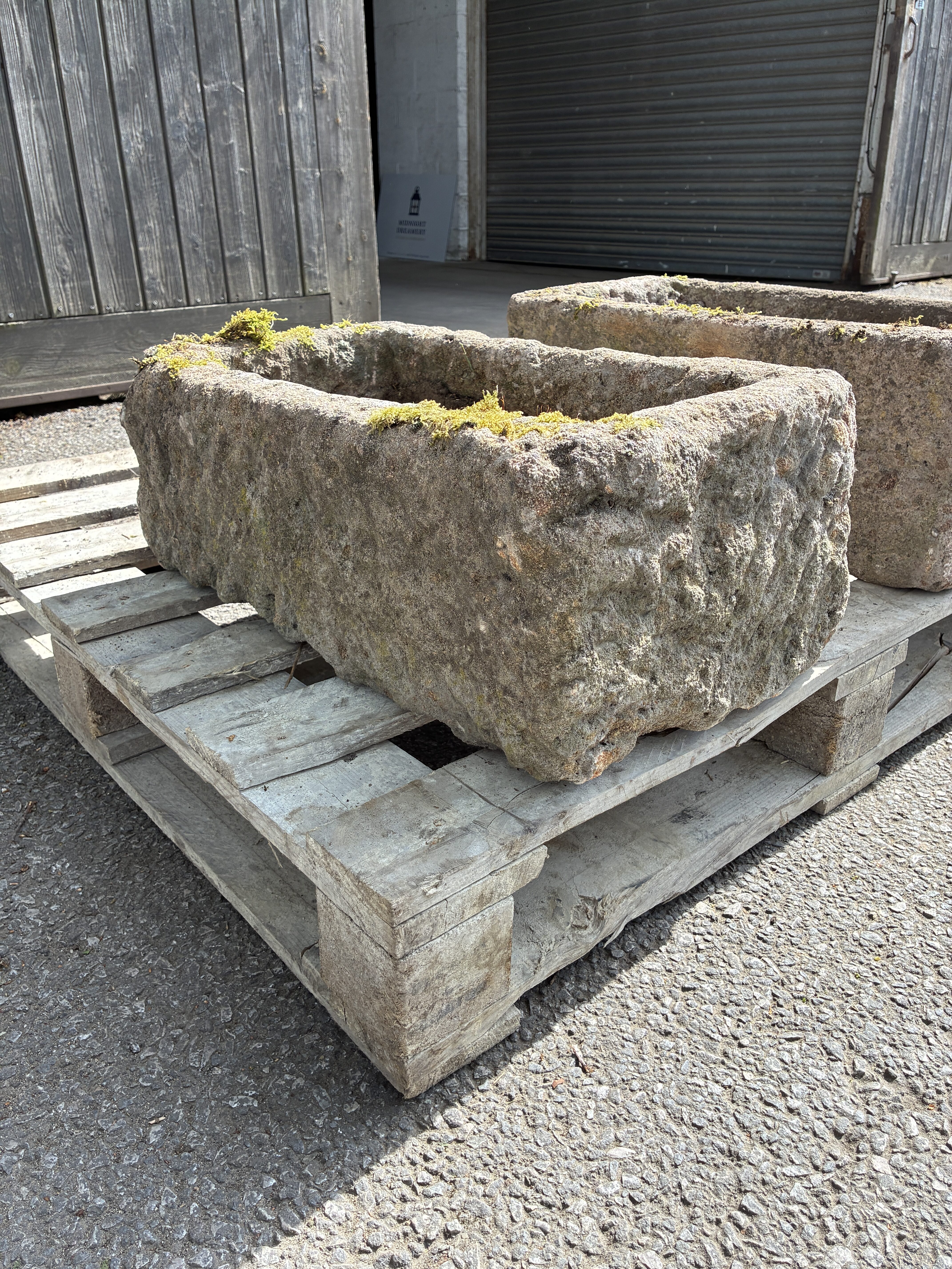 A lovely identical size and very near pair of Yorkshire gritstone troughs both with a lovely patina