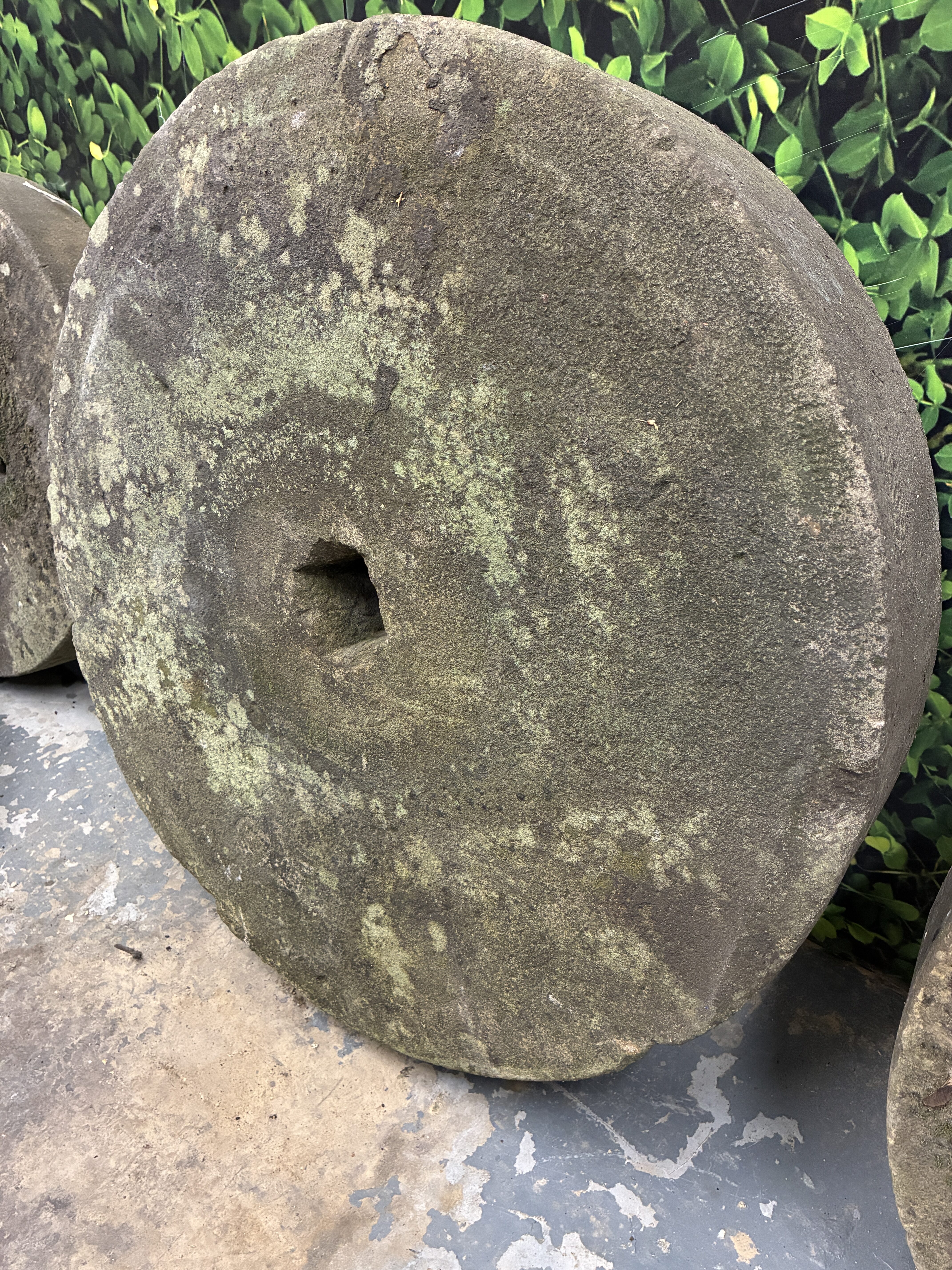 Superb large antique millstone. Great weathering and patina. Ideal for carving onto. Size is 29” diameter and 6” thickness with a 3” square central hole PRICE - £395