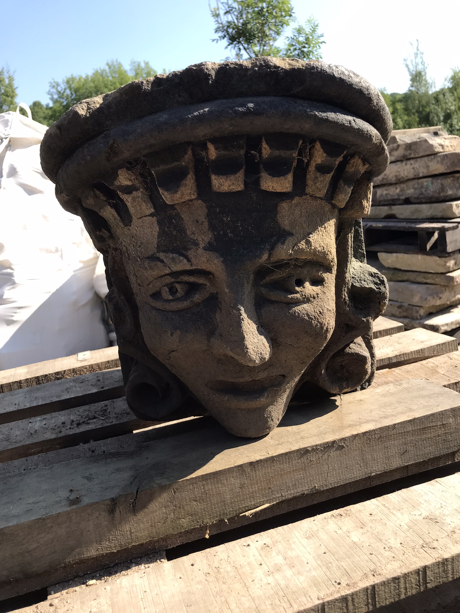 Superb large hand carved stone head likely to date from the 19th Century although could possibly be earlier. This would have originally been on the corner of a building. Further photos and details on request.