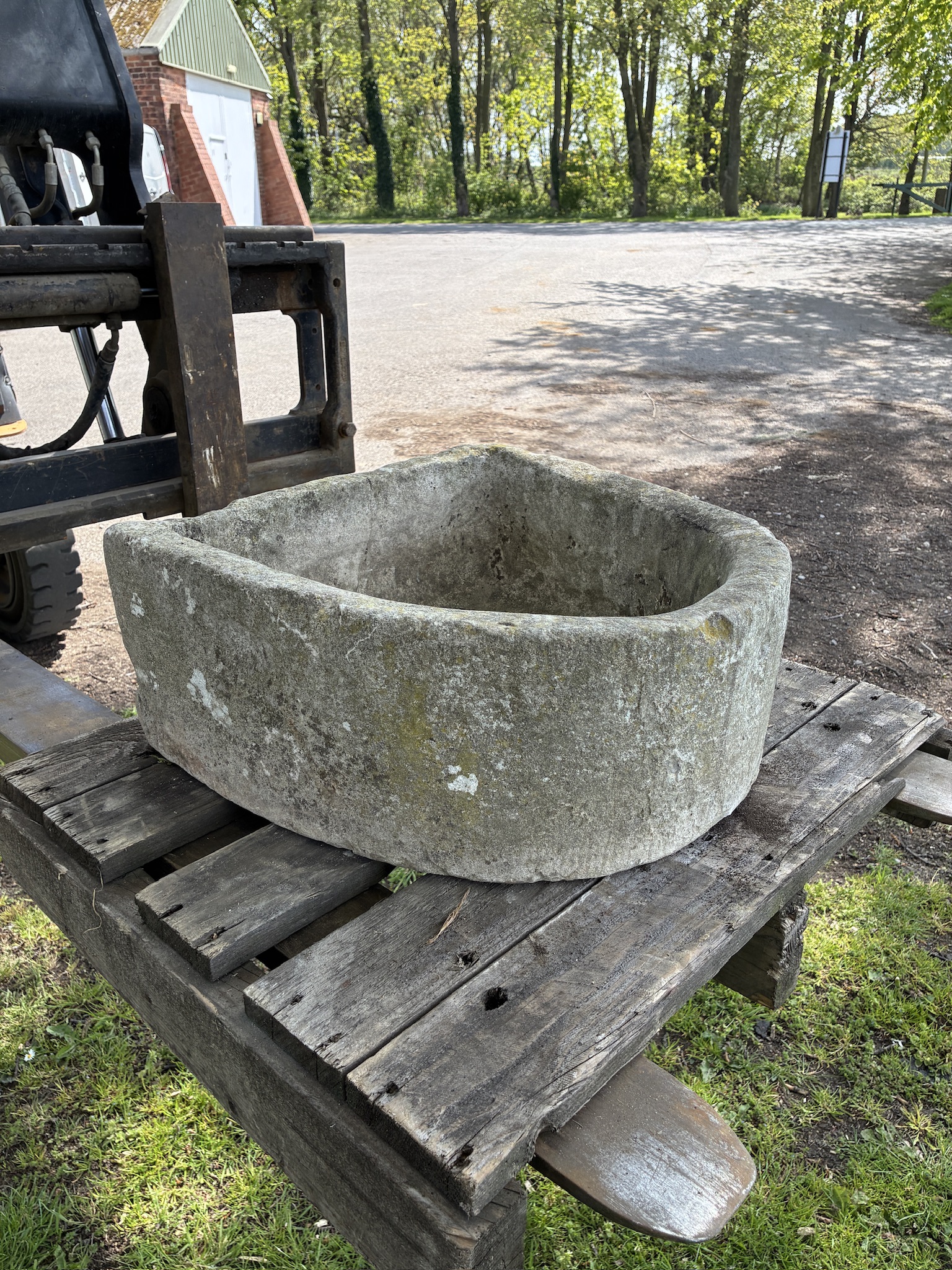 A nice looking D shape pump stone trough, unfortunately does have a hairline crack running about 6” down the back but does not detract from the trough and appears to be quite an old crack. Once planted not noticeable and the integrity of the trough still appears to be very sound