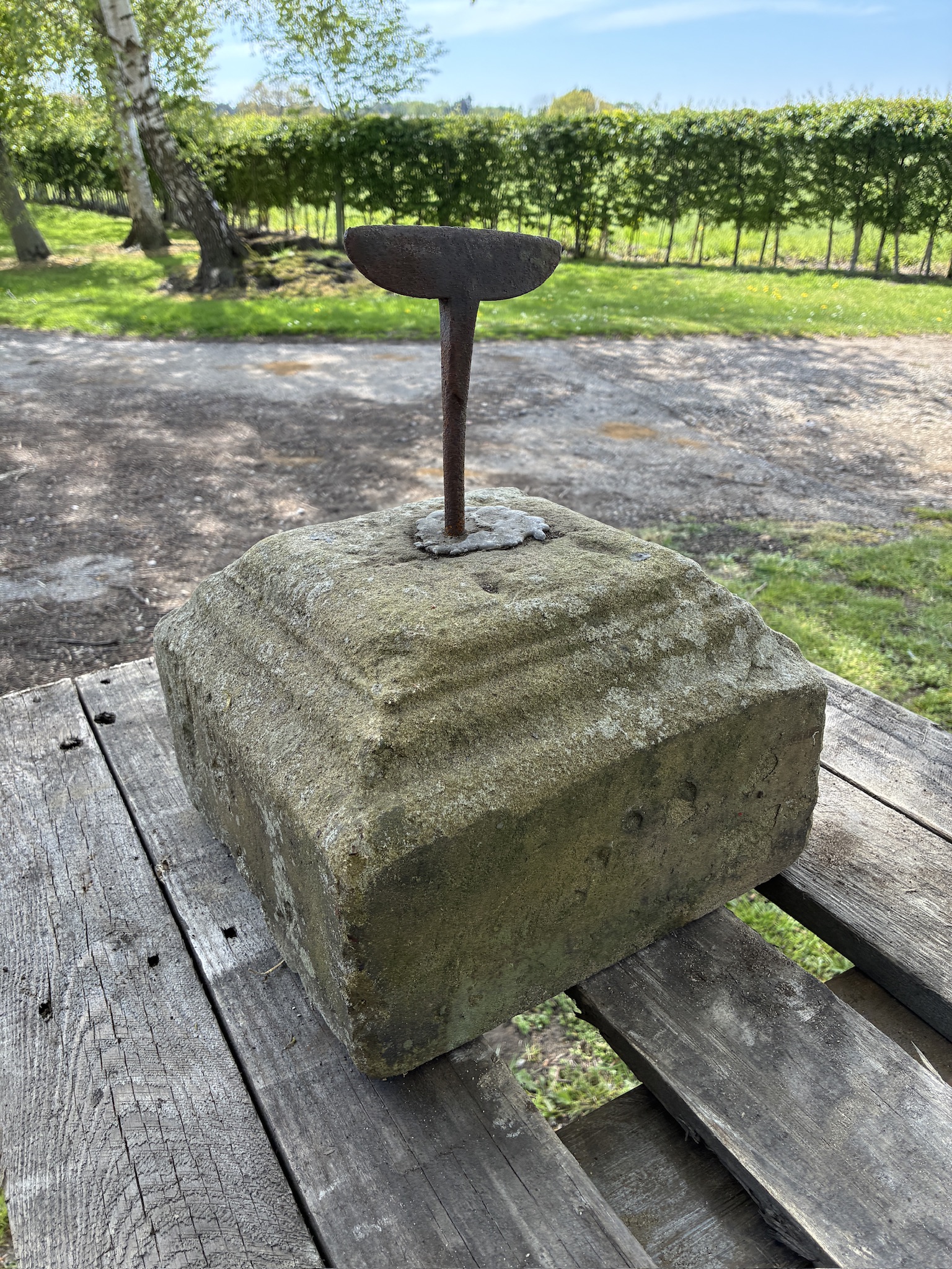 Early C18th cast iron and stone boot scraper. Quite a crude naive piece of cast iron leaded into a lovely shaped piece of yorkstone. Probably estate made for tradesman / servant entrance use as opposed to a more elaborate front of house piece.