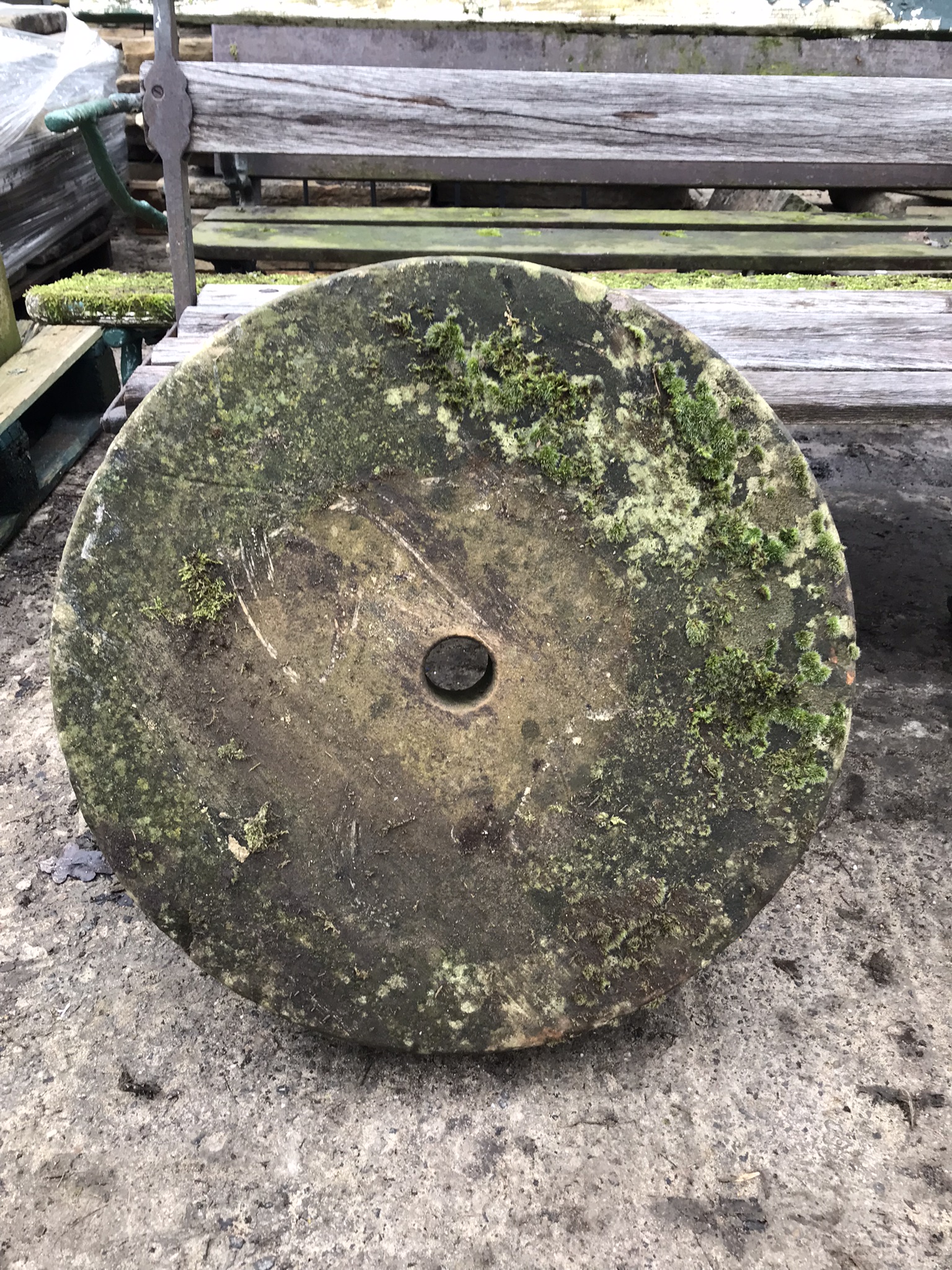 Lovely weathered millstone with great patina. 23” diameter 4” thick