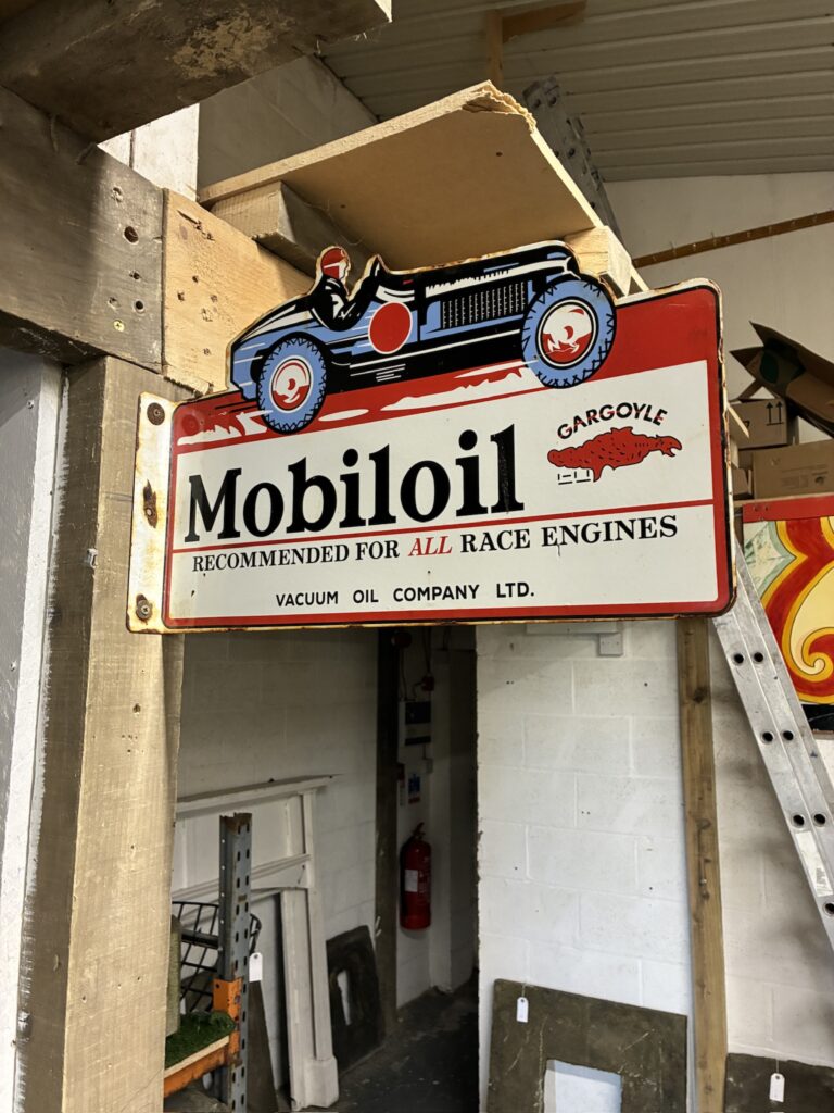 Fantastic double sided Mobiloil enamel advertising sign with racing car, probably a later piece as opposed to a 1930’s original hence the price. Last original I saw sold for £940 plus fees at auction. Still a great decorative piece.