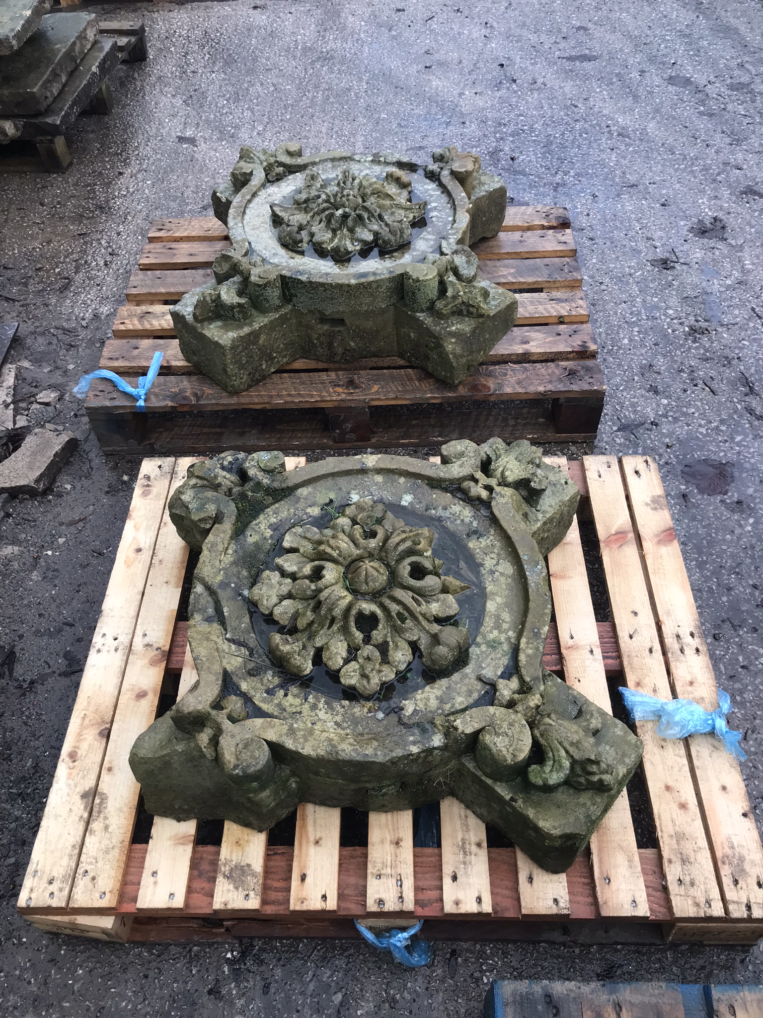 Stunning pair of C19th hand carved Yorkstone plaques. Slight damage but still very impressive at 3 ft across. Reclaimed from a building in Bradford when demolished some years ago.