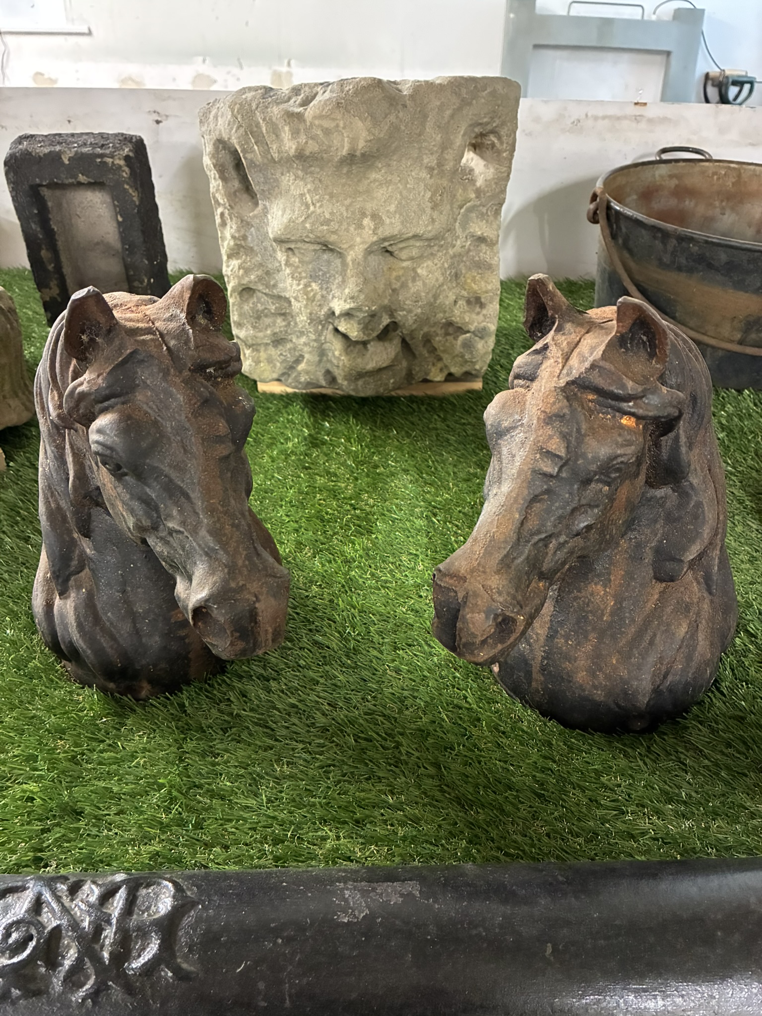 Lovely pair of early 20th century cast iron horses heads, likely made to sit on top of round posts but do make an attractive pair of ornaments.