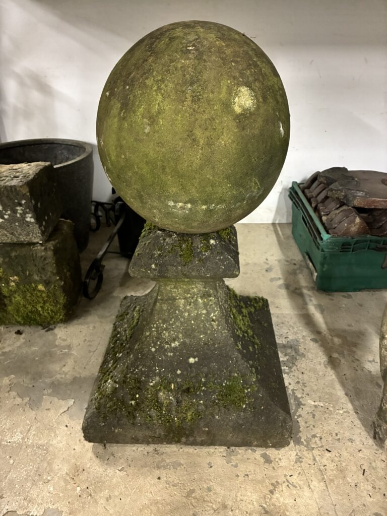 Reclaimed Yorkstone ball finial, ball diameter is approx 13” and stands at approx 28” high. Not 100% sure they original to each other but both pieces are of the same period, likely early C19th and do sit well together.