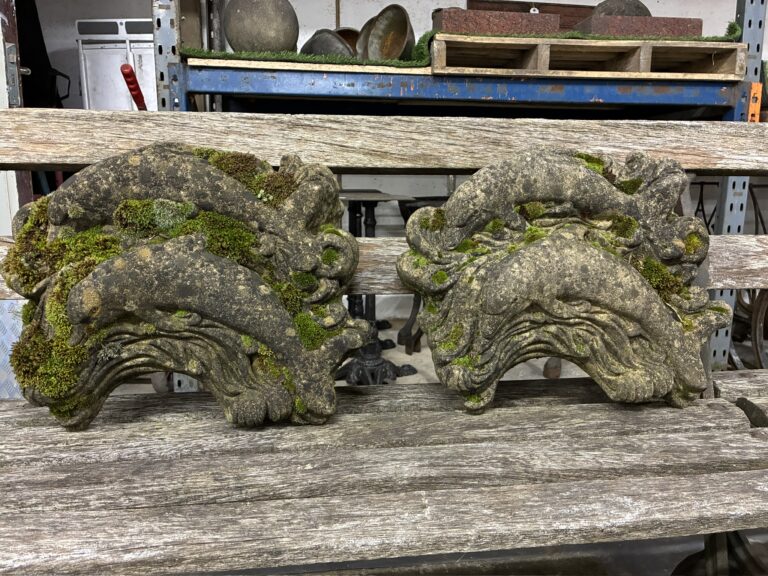 A nice decorative pair of wall hanging planters featuring a pair of leaping dolphins. Reconstituted but very well weathered giving a great patina.